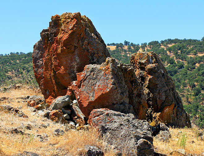 | Lichen Covered Rocks on Rocky Ridge, Above the South End of Lake Del Valle. |