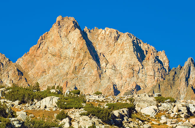 | Early morning view of Bear Creek Spire from the floor of Little Lakes Valley near the start of the trail to Mono Pass. |