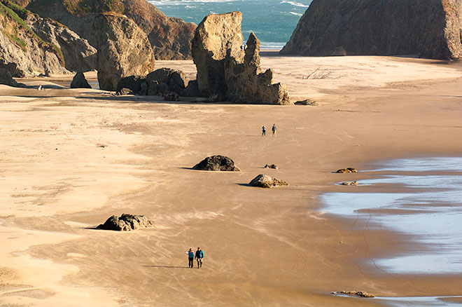 | Telephoto view of beahc walkers on Bandon Beach from above. Bandon, Oregon. |