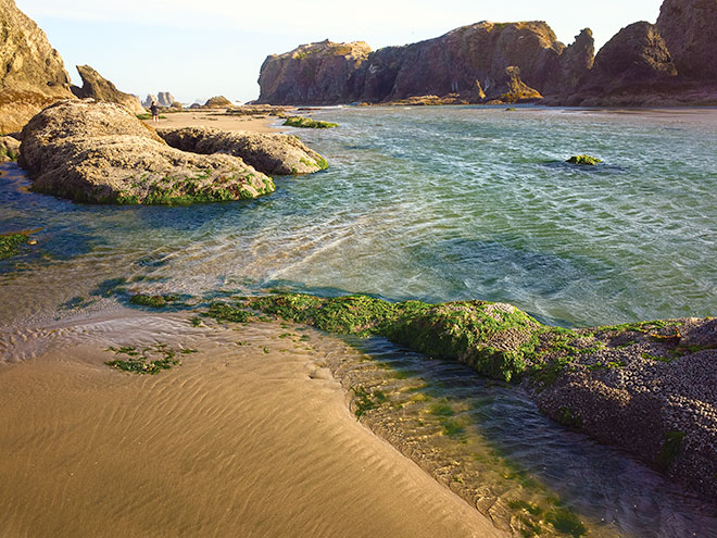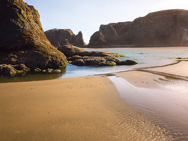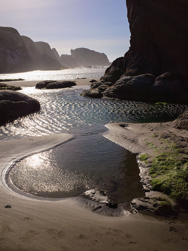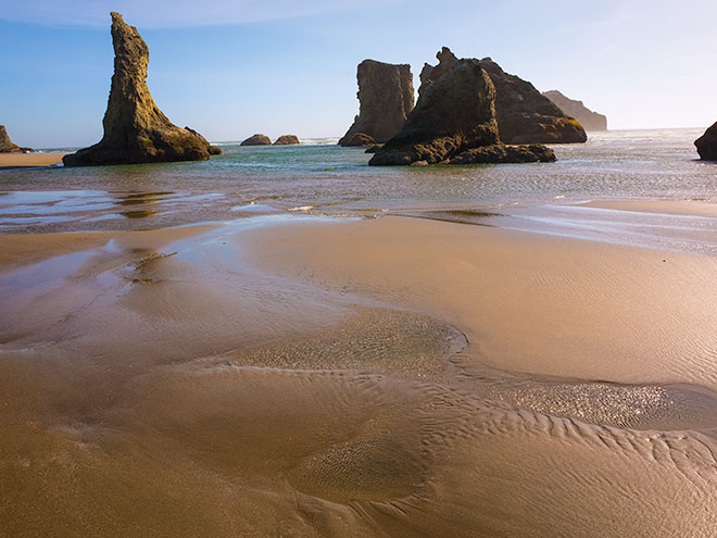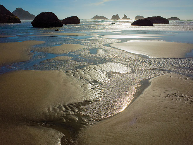 | Intricate water patterns on Bandon Beach, with offshore stacks on the horizon. Bandon, Oregon. |