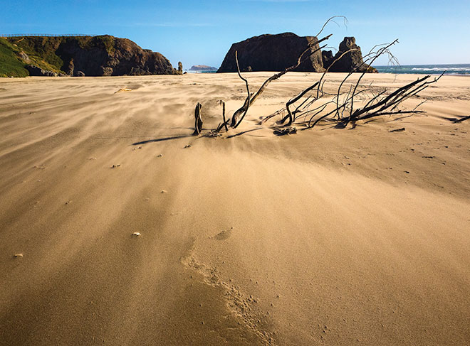 | Blowing beach sand and distant rock stacks on Bandon Beach. Bandon, Oregon. |