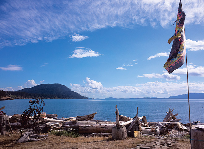 | Beach flags and paraphernalia on the beach at Legoe Bay, Lummi Island. |