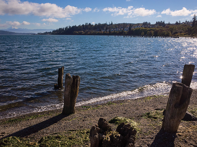 | Wavelets on a breezy day, on the shingle beach below the Anacortes Ferry Terminal, looking northwest towards Nt. Baker. |