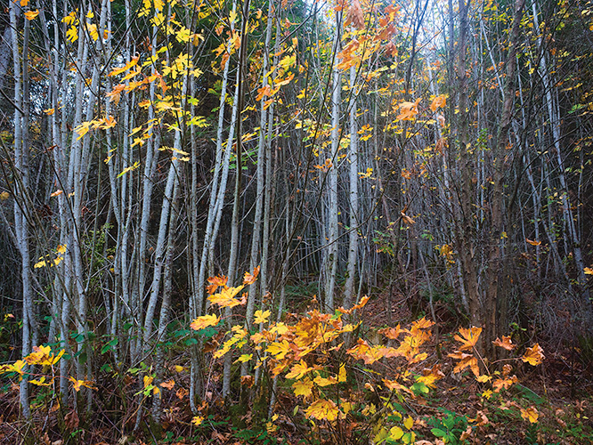 Stand of young, skinny big-leaf maple trees on Stewart Mountain, Bellingham.